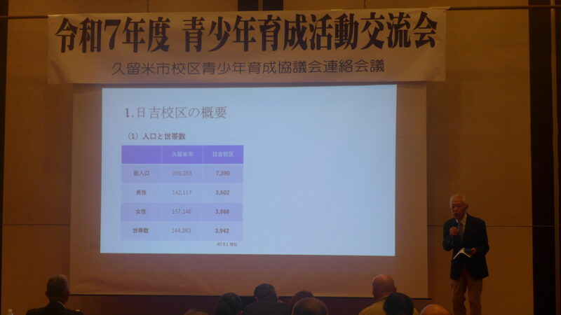今年度は、日吉・御井・安武・柴刈・城島の5校区が登壇し、それぞれの地域の特色を生かした活動の紹介や、青少年の健全育成に向けた取り組み、直面している課題への向き合い方などを発表いただきました。